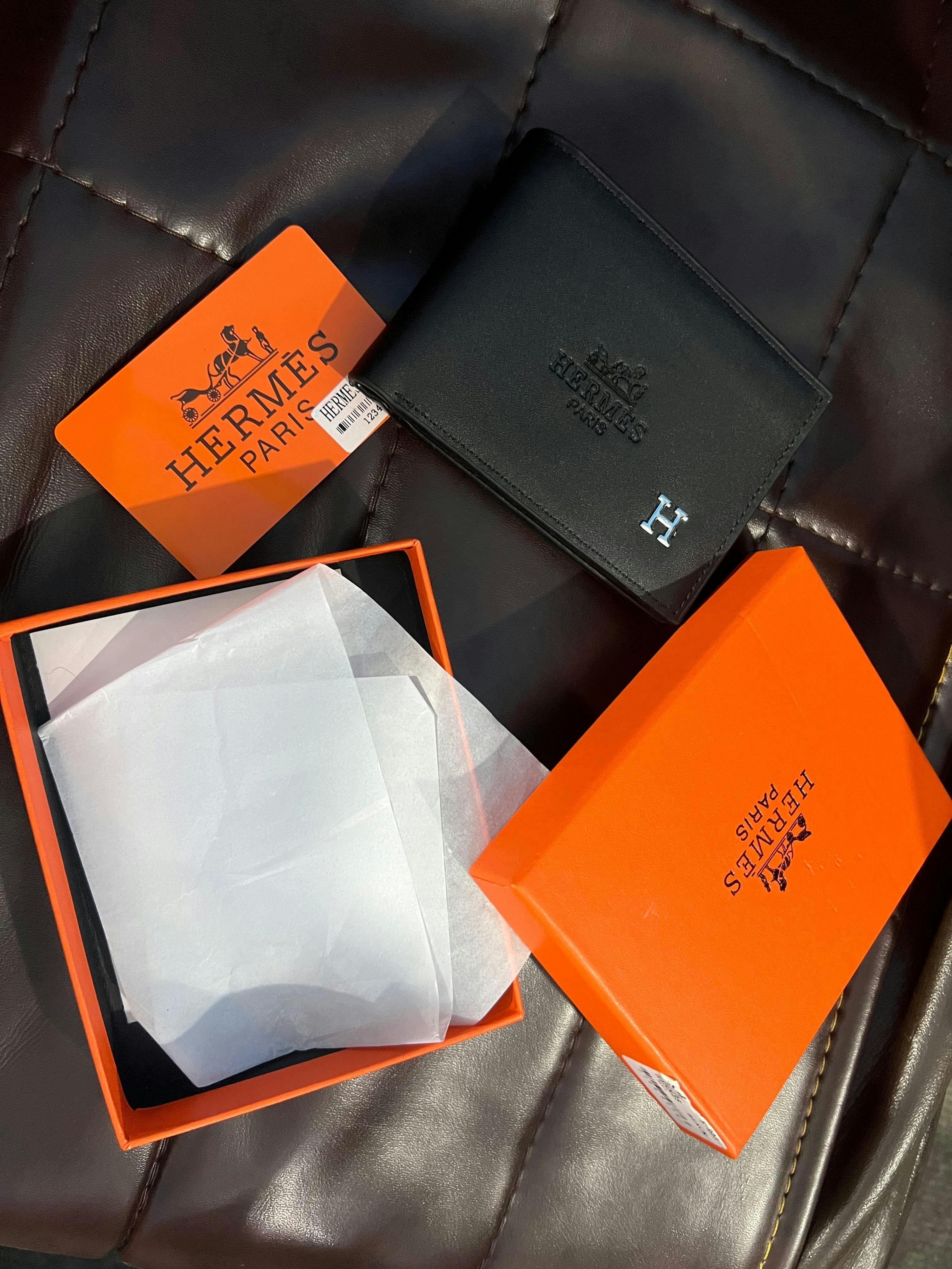 Made from premium genuine leather, this wallet features a sleek jet-black finish that’s both sophisticated and versatile, suitable for any occasion. The design is enhanced with the iconic Hermès logo, embossed with precision, reflecting the brand’s heritage of luxury and attention to detail.
